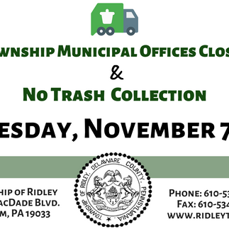 No Trash Collection - Tuesday, November 7thcontinolcNov 5, 20231 min readTownship Municipal Offices will be CLOSED, and there will be NO TRASH COLLECTED on Tuesday, November 7, 2023, in observance of Election Day.
